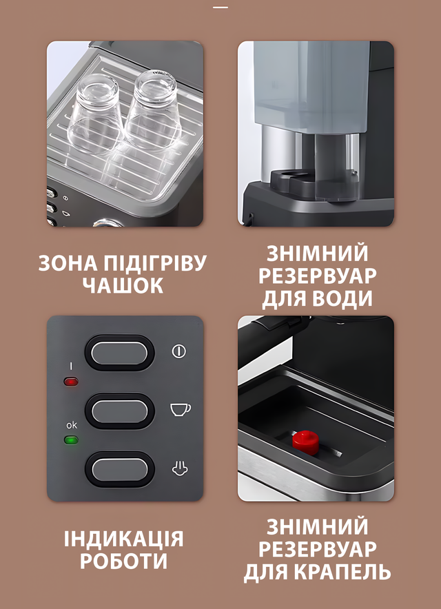 - ✔ Площадка для подогрева чашек – ваш эспрессо остается горячим дольше.