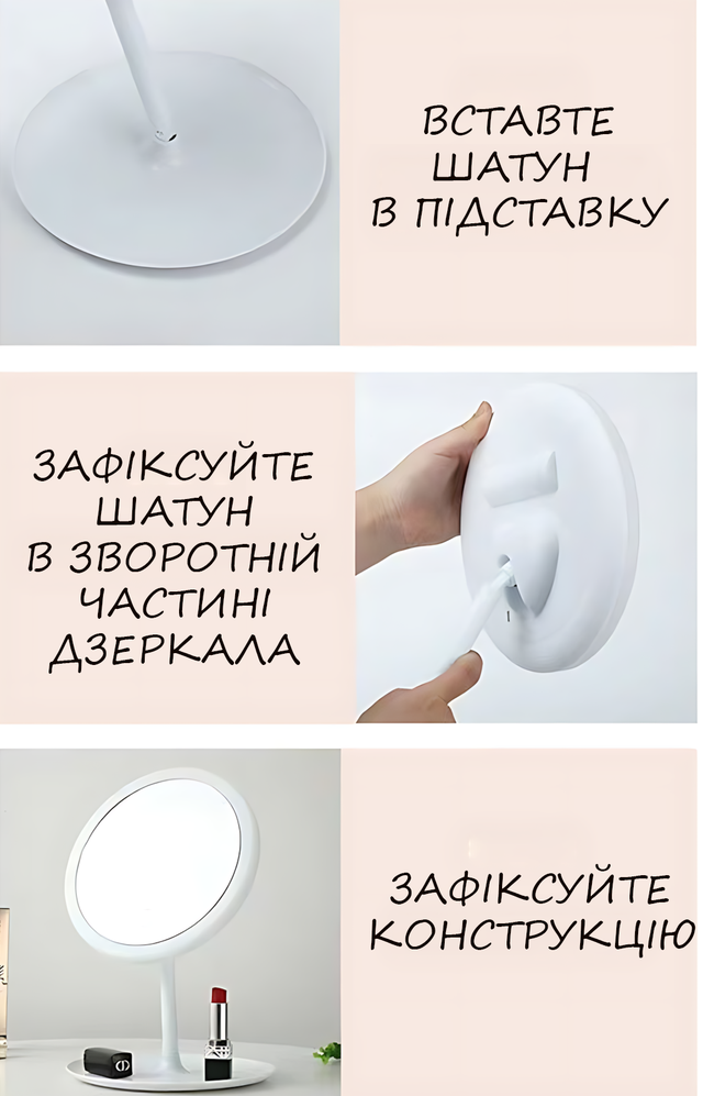 - 360° освещение без бликов: Светодиоды обеспечивают разнонаправленное освещение, без теней и бликов, что облегчает нанесение макияжа;