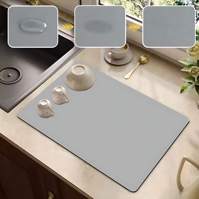 - Мгновенное впитывание влаги. Материал с диатомитом моментально поглощает капли. Без разводов и луж.