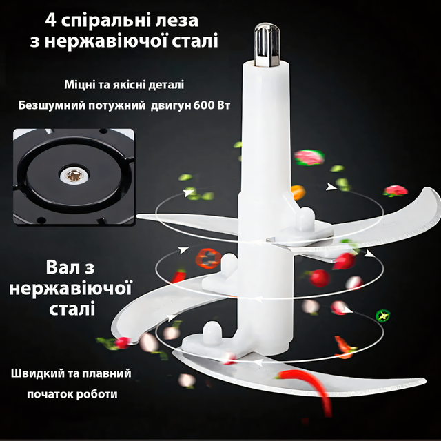 - Мощность: Блендер обладает мощностью 600 Вт, что обеспечивает эффективное и быстрое измельчение продуктов любой твердости. Независимо от того, нужно ли вам измельчить зелень, орехи, овощи или фрукты, этот блендер справится с задачей без проблем;