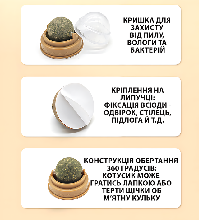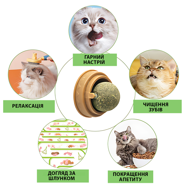 Порадуйте пушистого друга настоящим кошачьим восторгом! Вращающийся мятный шарик – это не просто лакомство, а аттракцион для мурчащих гурманов. Он крутится, манит ароматом кошачьей мяты и пробуждает игривые инстинкты даже у самых ленивых усатиков! Благодаря липучке можно закрепить его на любой гладкой поверхности – теперь развлечение будет везде: на полу, стене или даже на любимом шкафу кота!