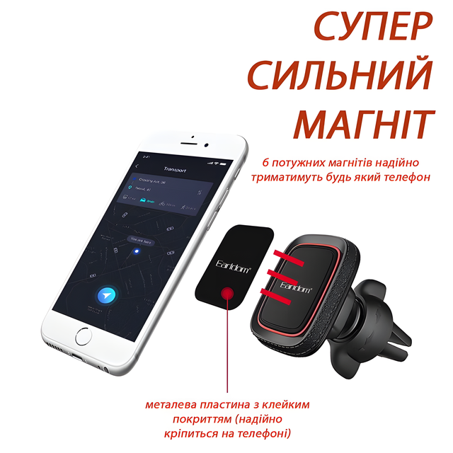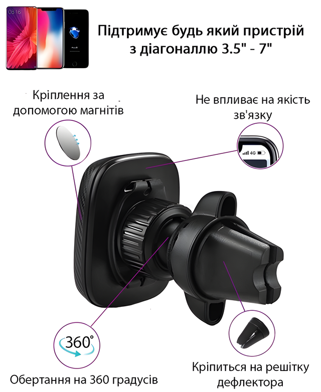 - Магнитное крепление для смартфона: Уникальный магнитный механизм обеспечивает быструю и безопасную установку вашего смартфона на держателе, предотвращая его падение во время движения;