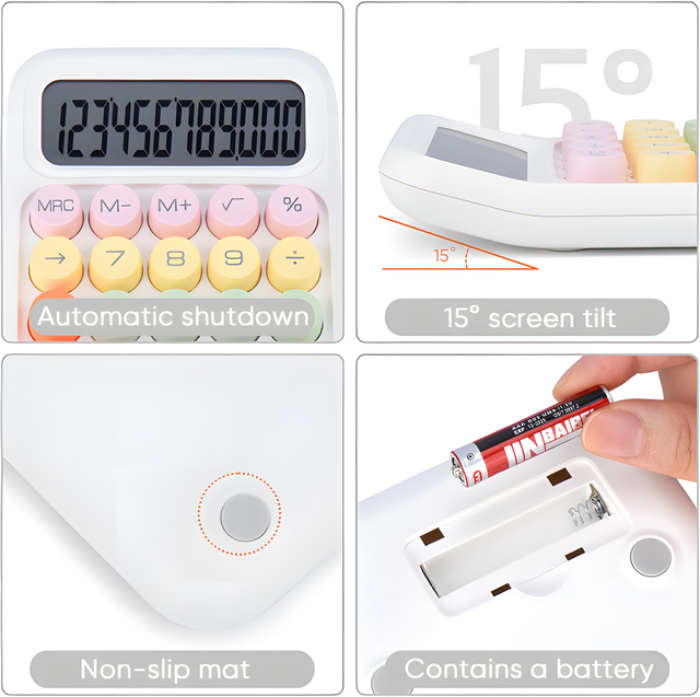 Изготовленный из прочного материала ABS, наш калькулятор готов служить вам долгие годы. Его компактный и портативный дизайн делает его идеальным для использования как на рабочем столе, так и в пути. Возможность питания от одной батареи ААА делает его удобным для использования дома, в школе или в офисе.