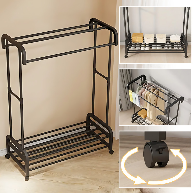 Металлическая напольная вешалка-органайзер для одежды с 4 полками, 3-мя перекладинами и колесами, до 40 кг, универсальная для дома и балкона