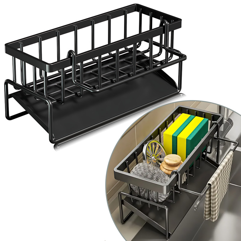 Металлический органайзер SKLM-8 для раковины, 230×90×110 мм, черный, из нержавеющей стали, с держателем для тряпки и водоотводом