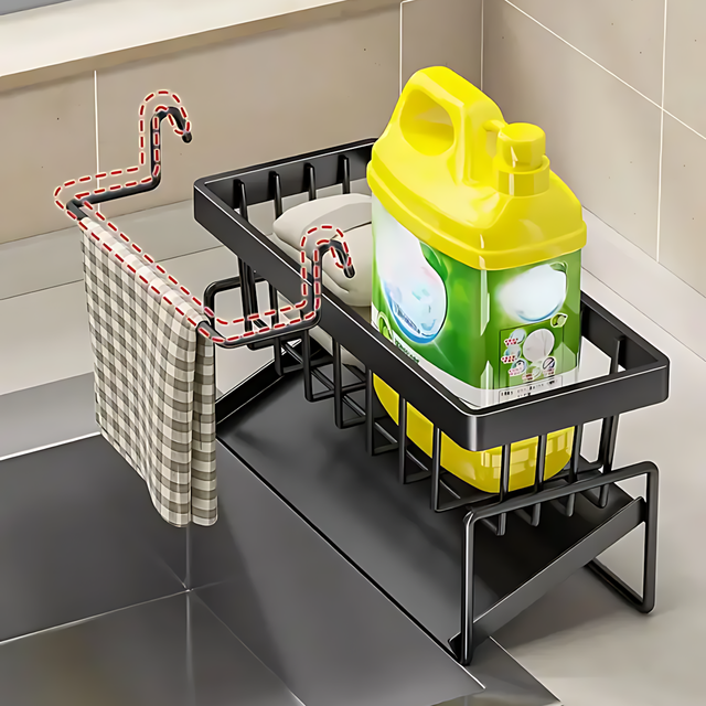 Этот черный красавчик не даст ни одной губке бесцельно болтаться по мойке. Каждой щётке — своё место. Каждой тряпке — сушиться красиво, а не прятаться за краном.