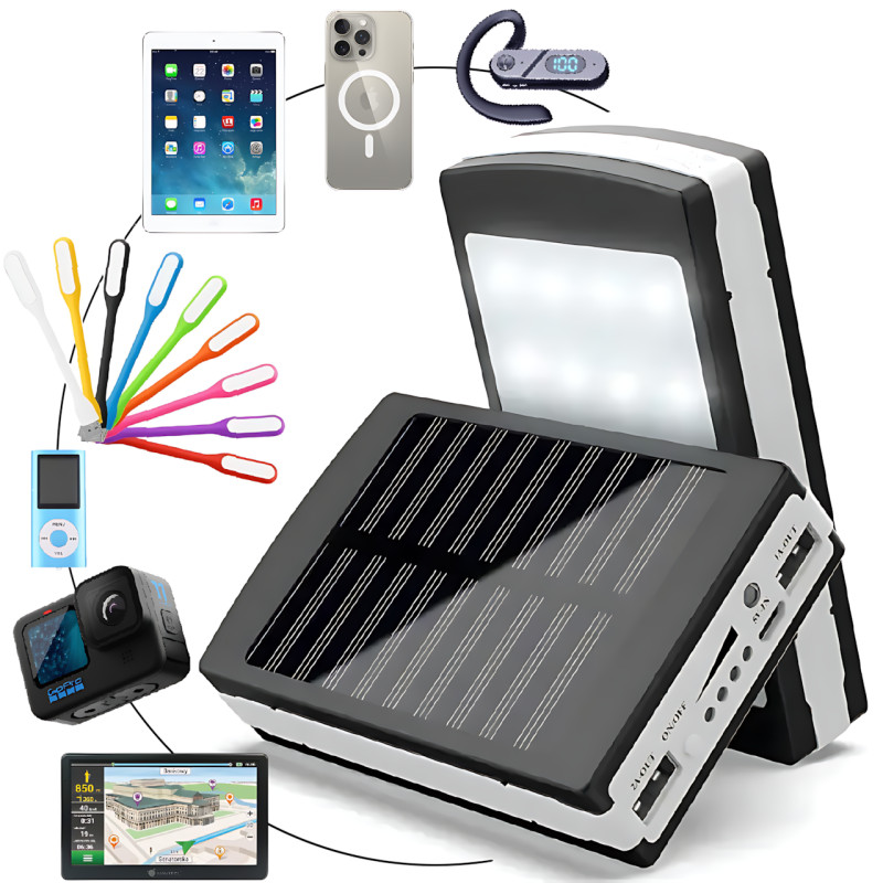 Останьтесь на связи, где бы вы ни находились, с уникальным Power Bank Solar 90000 mAh! Этот мощный и стильный портативный аккумулятор станет вашим верным спутником в любых условиях – будь то активный отдых, путешествие или повседневная рутина.