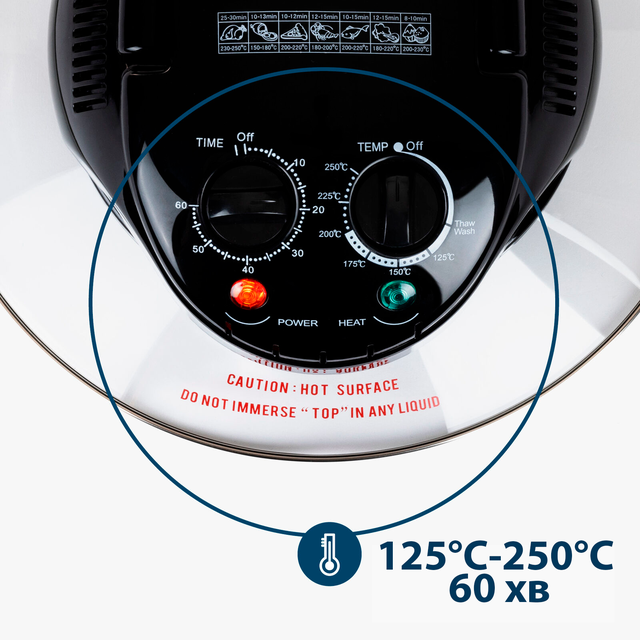 - Регулировка температуры: Возможность регулировать температуру обеспечивает правильное и идеальное приготовление вашей еды. Диапазон регулировки температуры составляет от 125 до 250 градусов по Цельсию, с 6 функциями предварительного нагрева;