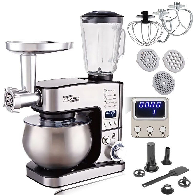 Многофункциональный кухонный комбайн Zepline ZP-135 – ваш главный помощник на кухне! Забудьте о долгих приготовлениях и куче кухонных приборов! Zepline ZP-135 – это 3-в-1: мощная мясорубка, блендер и тестомес, которые помогут вам легко и быстро создавать кулинарные шедевры.