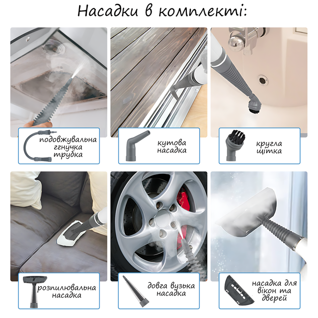 - Широкое применение: Пароочиститель можно использовать для чистки вытяжек, стиральных машин, стен, полов, окон, дверей, мебели и других поверхностей, широко применим в кухне, ванной комнате, мебели, автомобиле и т.д.;