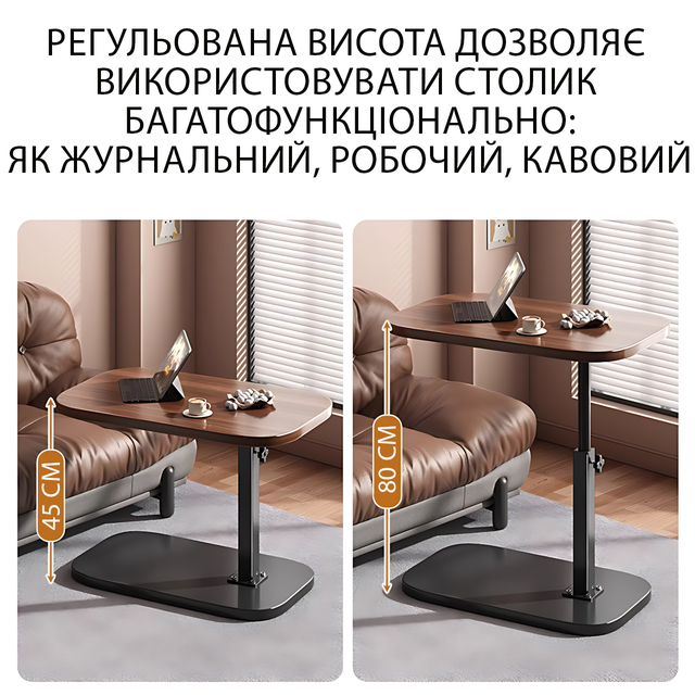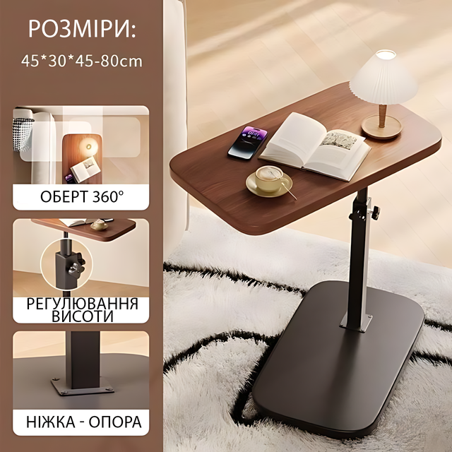 Многофункциональный придиванный столик 3в1 с регулируемой высотой (45–80 см), вращающейся на 360° столешницей
