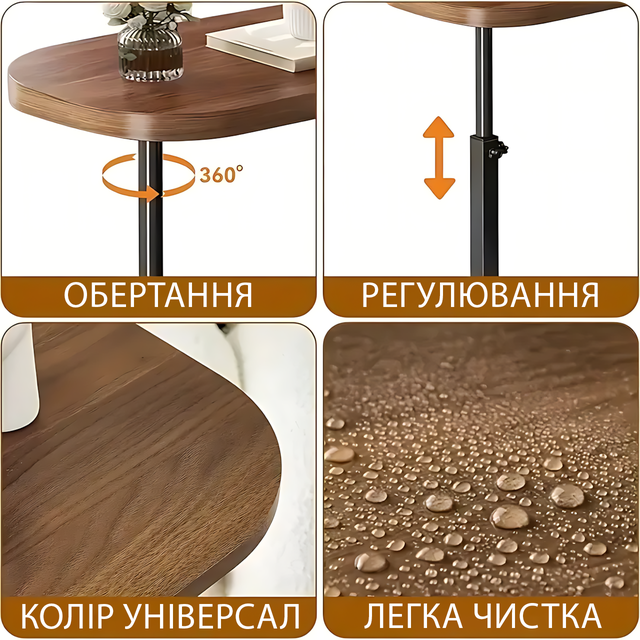 Многофункциональный придиванный столик 3в1 с регулируемой высотой (45–80 см), вращающейся на 360° столешницей, цельной овальной МДФ-панелью 40×30 см, C-образный, на одной ножке, мобильный, до 65 кг