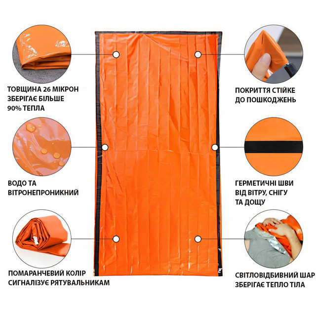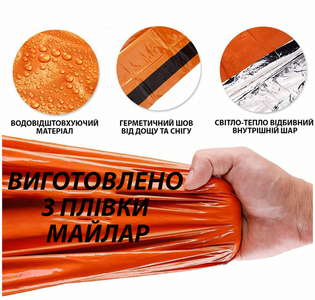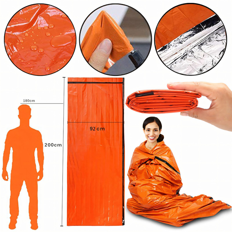 - Универсальность использования: Может быть использован как аварийный спальный мешок, а также в качестве защиты от ветра, солнца и влаги, а также для сбора воды и создания временного укрытия.