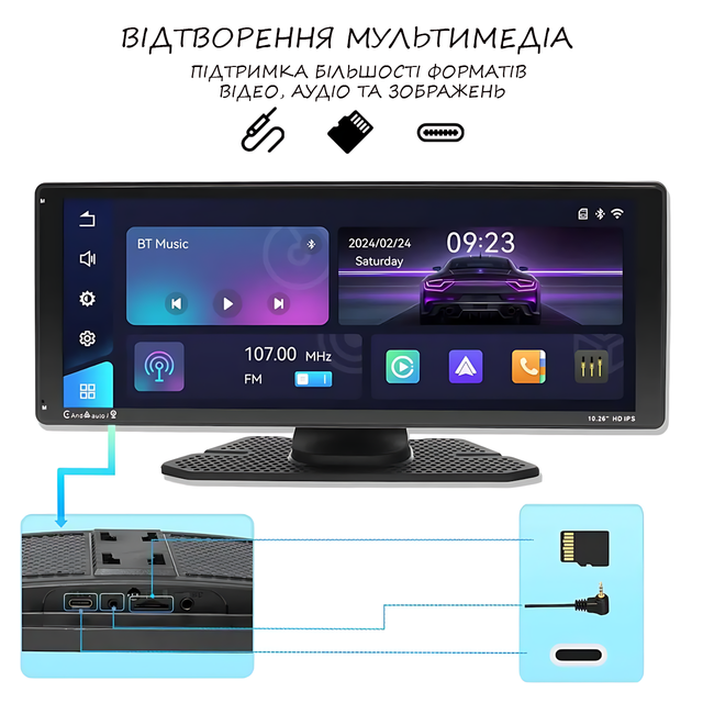 10,26-дюймовый сенсорный экран IPS беспроводной портативной автомобильной стереосистемы с поддержкой Apple Carplay и Android Auto — это мощное и многофункциональное устройство, предназначенное для современных автомобилистов. Эта автомобильная стереосистема обеспечивает удобный доступ к мультимедийным приложениям, навигации и телефону через два Bluetooth-подключения и функцию Mirror Link. Встроенный навигационный блок с поддержкой FM-радио и AUX-входа дополнительно расширяет функционал, делая каждую поездку более комфортной и безопасной.