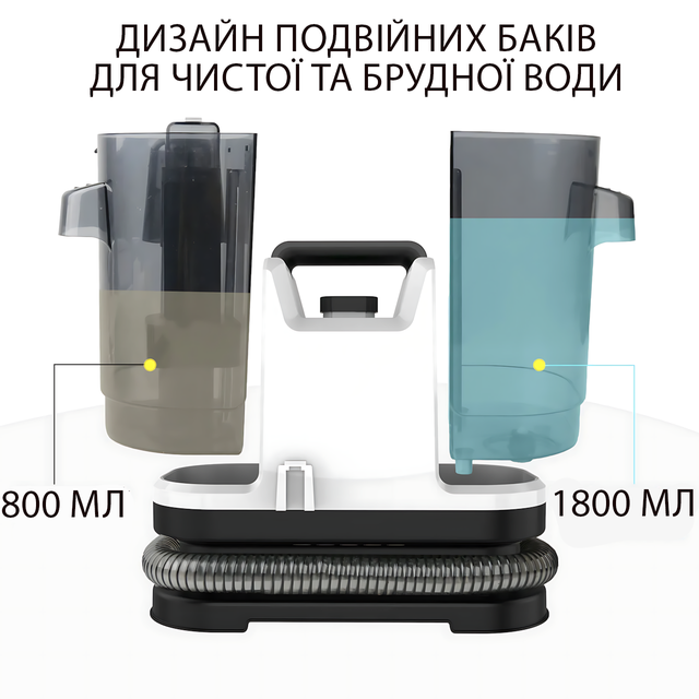 Бак с чистой водой — 1.8 л, бак для грязной — 0.8 л. Всё чётко! Один наполняешь, другой — опустошаешь.