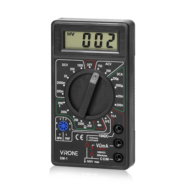Компактный тестер измеряет напряжение постоянного и переменного тока, силу постоянного тока, сопротивление, проверяет транзисторы и диоды. Переключатель выбирает параметры, каждый имеет свою зону и несколько секторов цифровых значений. Есть сектор для проверки hFE транзисторов и разъемы для NPN и PNP. Для измерений поставляются два щупа, питание от батареи. Предупредительная надпись "NV" появляется при измерении максимальных напряжений.