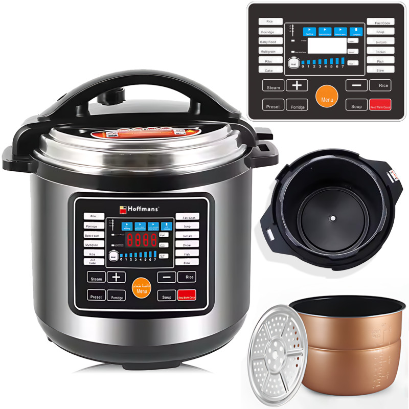 Мультиварка Hoffmans HM-721, 14 л, 2400 Вт, электронное управление, антипригарная чаша, многофункциональное меню, дисплей, корпус из нержавеющей стали