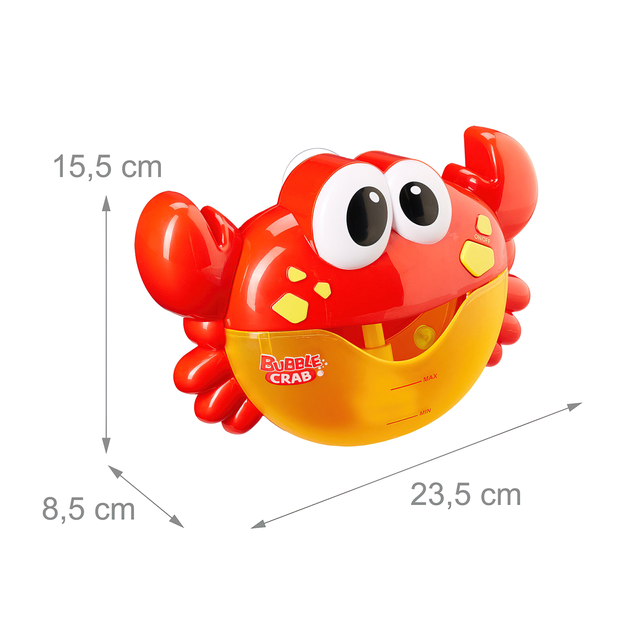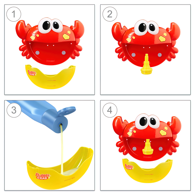 Процесс запуска пены прост: просто налейте детское мыльное средство в съемный контейнер и включите игрушку. Краб начнет создавать облака пены и одновременно проигрывать веселые детские мелодии. Для создания пены можно использовать гель для душа или шампунь - просто смешайте 5-30 мл средства с водой, и чем больше концентрация, тем больше пены получится!