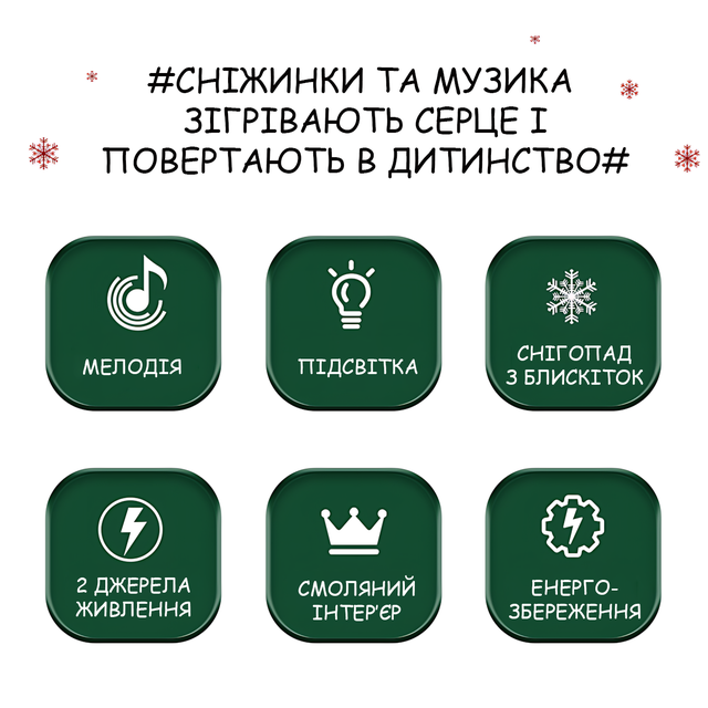 | Особенности | имитация снегопада, вращение фигурки, музыкальная мелодия |