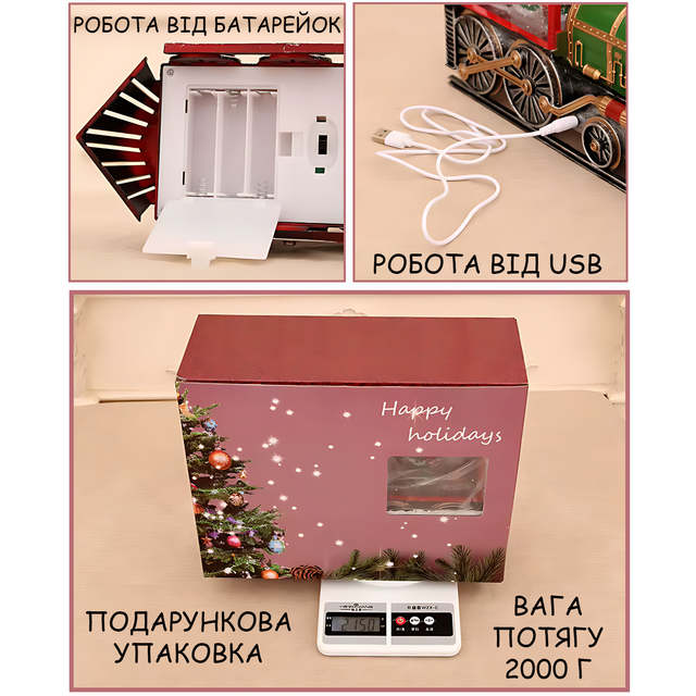 Музыкальный праздничный фонарь зимний поезд 806 с подсветкой и эффектом снегопада, фигурками внутри, USB + батарейки