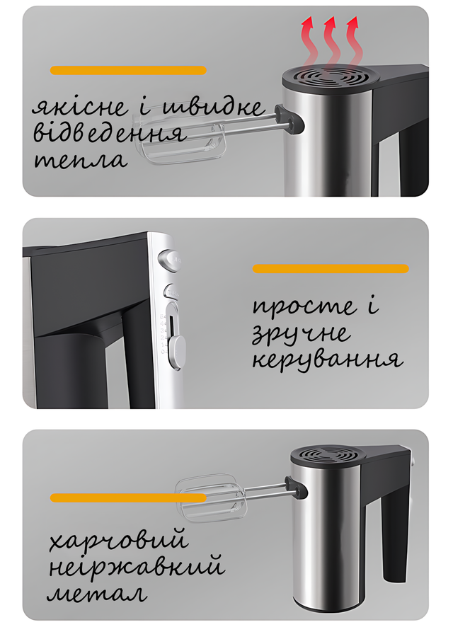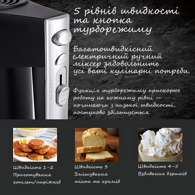 - 🍰 5 скоростей + Турбо — от нежного крема до тяжёлого теста.