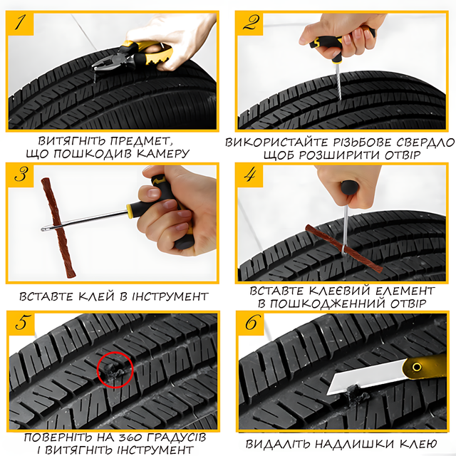 - Универсальность: Этот набор подходит для ремонта проколов бескамерных шин различных транспортных средств, таких как автомобили, мотоциклы, велосипеды и другие. Его можно использовать как в экстренных ситуациях, так и для планового ремонта шин в мастерских.