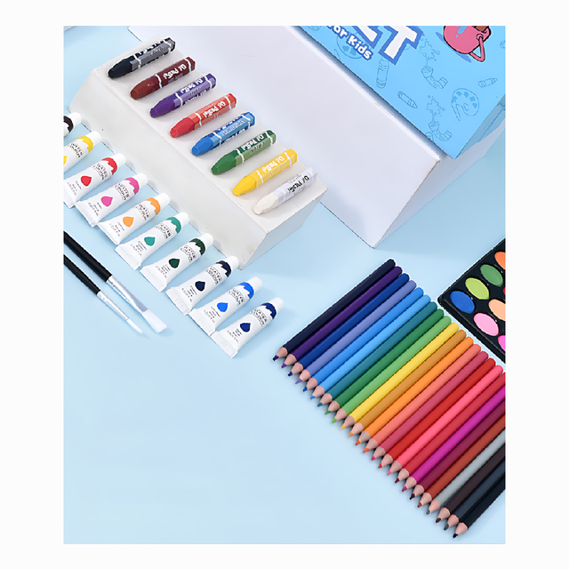 - Развитие чувства цвета: Набор включает яркие краски и карандаши, что помогает детям осваивать основы цветового восприятия и смешивания цветов;