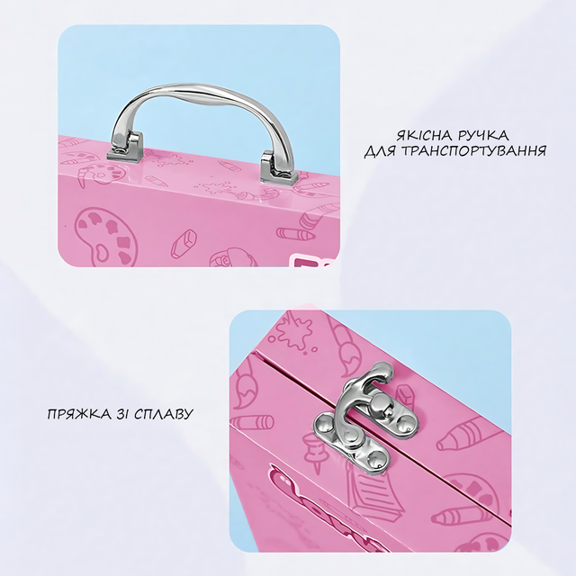 Набор юного художника в розовом чемоданчике Art Set на 82 предмета — это прекрасный комплект для развития детского творчества. Внутри набора находятся разнообразные инструменты для рисования, такие как цветные карандаши, маркеры, акварельные краски и кисти. Чемоданчик изготовлен из прочного пластика с металлическими застёжками, что обеспечивает надежное хранение и транспортировку. Лёгкий вес и удобная ручка делают его идеальным для использования как дома, так и в поездках. Яркий дизайнерский рисунок на кейсе привлекает внимание и вдохновляет на творчество. Набор предназначен для детей от трёх лет, стимулирует развитие художественных навыков с раннего возраста.