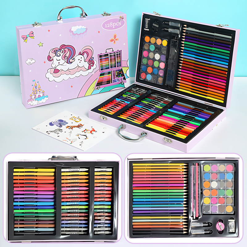 Если ребёнок мечтает рисовать, сочинять миры, превращать простые линии в чудеса — этот набор для творчества из 128 предметов станет его личной волшебной мастерской! 💫