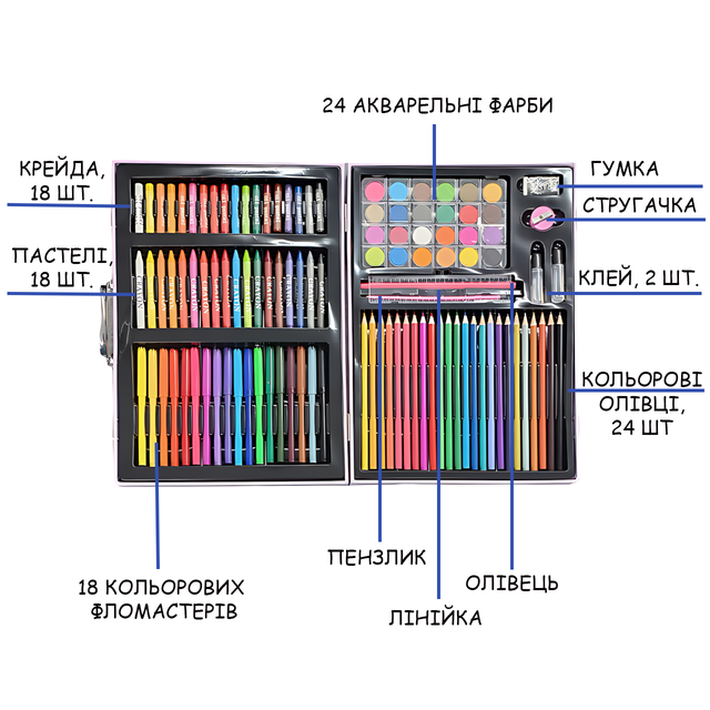 Внутри аккуратного чемоданчика — целая радуга возможностей! Карандаши, фломастеры, краски, пастель, кисть, линейка, точилка, клей и даже ластик (куда же без него!). Всё аккуратно разложено, как в студии художника.