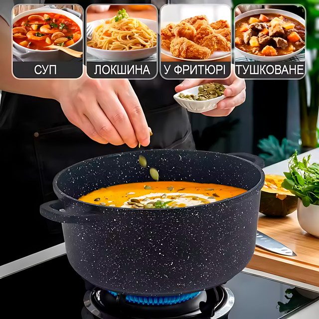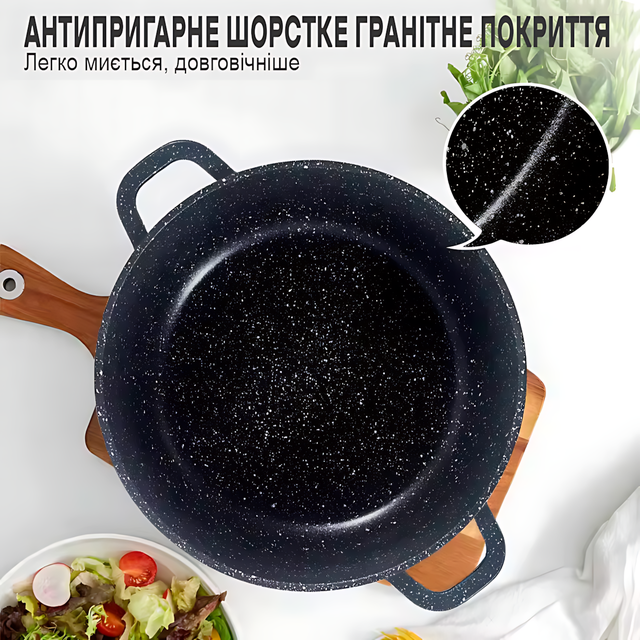 - Прочность и долговечность: Посуда изготовлена из высококачественного алюминия с мраморным покрытием, которое устойчиво к механическим повреждениям и высоким температурам;
