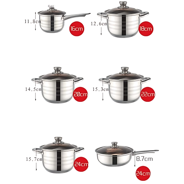 - Количество предметов: 6 (кастрюли 18 см, 20 см, 22 см, 24 см; сотейник 16 см; сковорода 24 см);