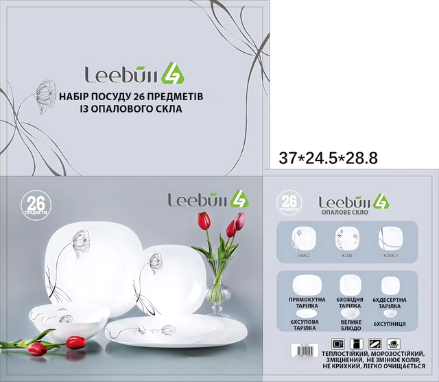 Набор посуды Leebull 26 предметов, опаловое стекло, 6 персон, белый с цветочным узором, модель 180511