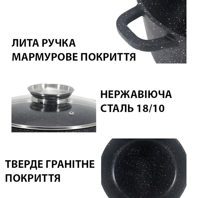 Набор посуды Top Kitchen TK00076, 7 предметов — кастрюли с мраморным антипригарным покрытием, толстое индукционное дно, стеклянные крышки, литой алюминий, для всех типов плит, черный