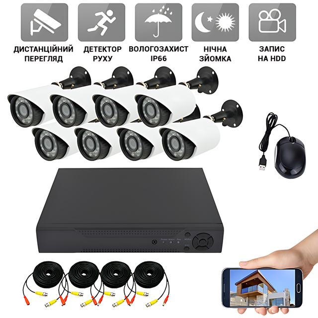 Набор видеонаблюдения DVR KIT 945, регистратор+8 камер, Gibrid, комплект уличного/внутреннего видеонаблюдения