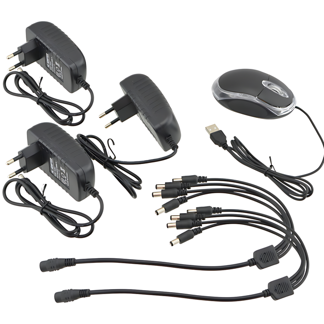 В комплекте системы видеонаблюдения | USB мышь|Блок питания для видеорегистратора|Инструкция|Кабель для соединения камер с видеорегистратором|Блок питания для камер |