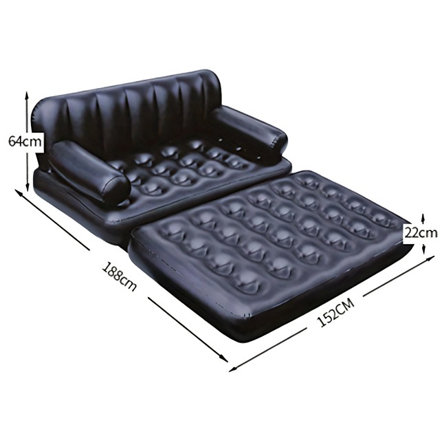 - 5 в 1 Трансформация: Эта надувная кровать предлагает 5 различных вариантов использования. Вы можете использовать ее как обычную двуспальную кровать, раскладывать в форме дивана с подлокотниками или даже в виде удобного шезлонга;