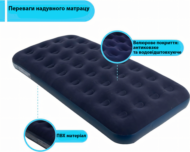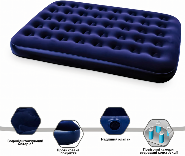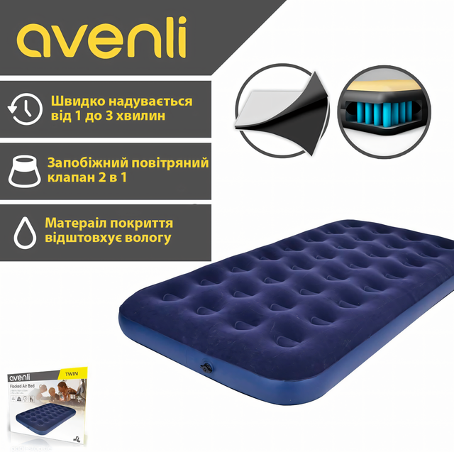 Надувной матрас Avenli Flocked Air Bed Twin, одноместный 191х99х22см, водоотталкивающий велюр и ПВХ, синий