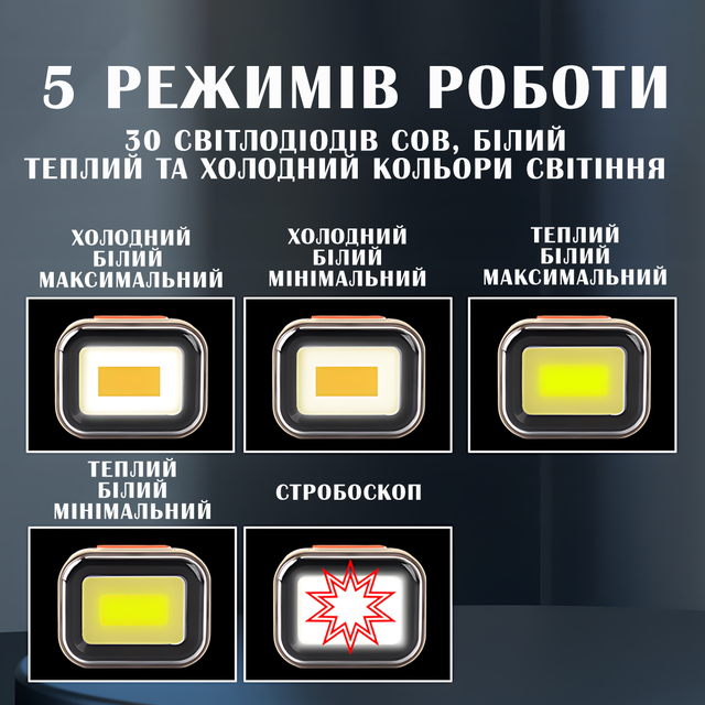 - Режимы свечения: 20 COB холодный белый максимальный, 20 COB холодный белый минимальный, 10 COB теплый белый максимальный, 10 COB теплый белый минимальный, совмещенный режим 30 COB холодный и теплый белый стробоскоп;