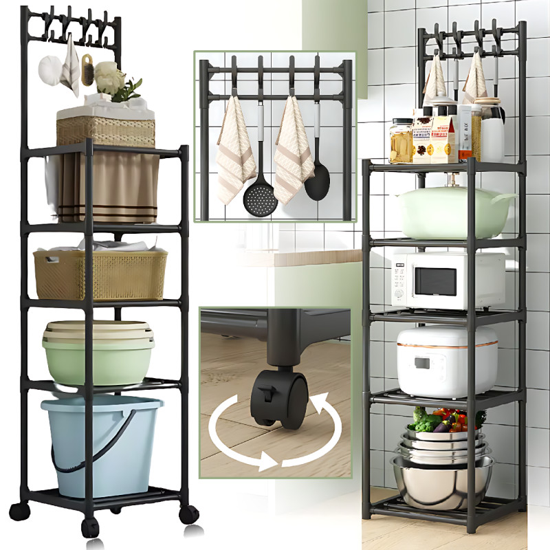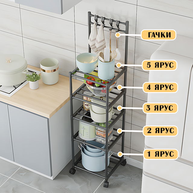 Напольный 5-ярусный стеллаж для кухни YH-6620-5, 5-ти уровневая кухонная полка для хранения на колесах