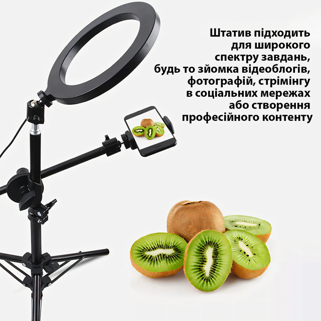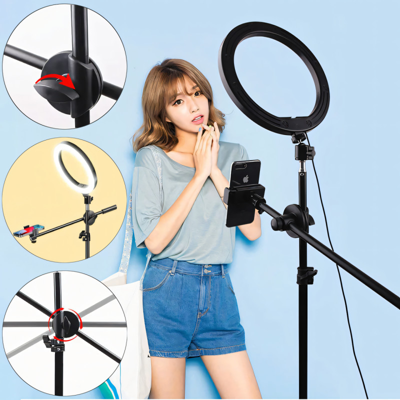 - Надежная установка: Штатив обеспечивает стабильное и надежное крепление кольцевой лампы и телефона, предотвращая их падение или смещение во время использования;