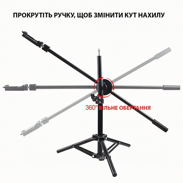 Благодаря своей легкой конструкции и компактным размерам, он легко переносится и собирается. Его максимальная высота составляет 160 см, что позволяет настроить камеру на нужную высоту для идеального ракурса. Длина палки для наклона - 62 см, обеспечивая дополнительную гибкость при настройке положения камеры.
