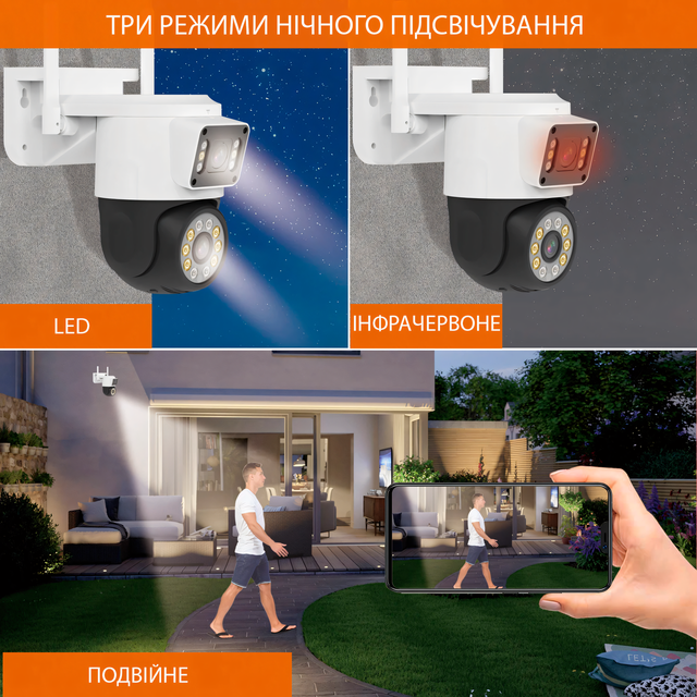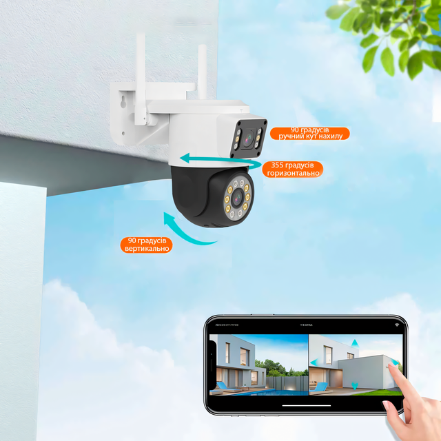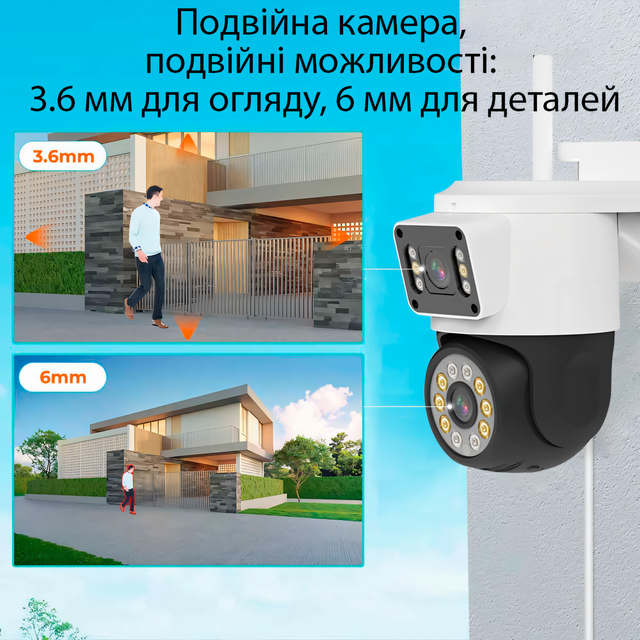 Наружная IP WiFi камера, 2 объектива 2+2 МП, 3.6-6 mm, звук, SD, IP66, отслеживание, сирена