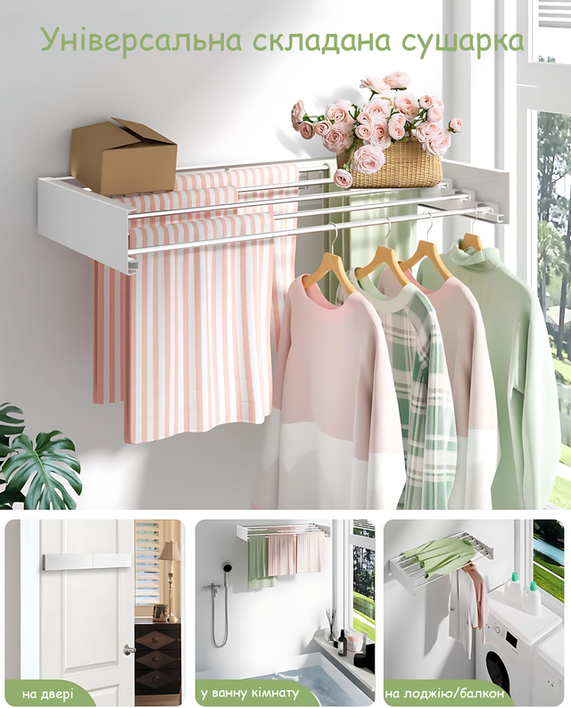 Открылась — сушит! Закрылась — и будто её не было! Никаких громоздких конструкций, путаницы со шнурами и перекошенных верёвок.