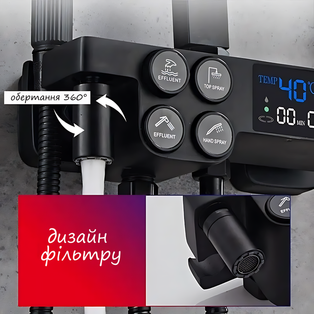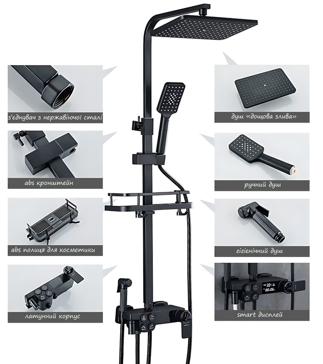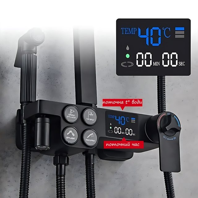 Стильный черный душевой гарнитур ARI с термостатом и цифровым дисплеем - это современное и функциональное решение для ванной комнаты. Гарнитур оснащен инновационным термостатом для точного контроля температуры и включает поворотный на 360° излив, встроенное биде, полку для косметики и различные формы распыления. Использование прочных материалов, таких как латунь, нержавеющая сталь и керамика, гарантирует долговечность и надежность. Гарнитур идеально подходит для семей, включая детей и пожилых людей, благодаря стабильной работе, простоте использования и встроенной защите от перепадов температуры.