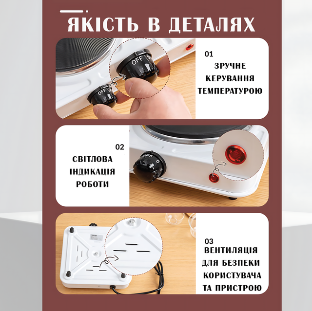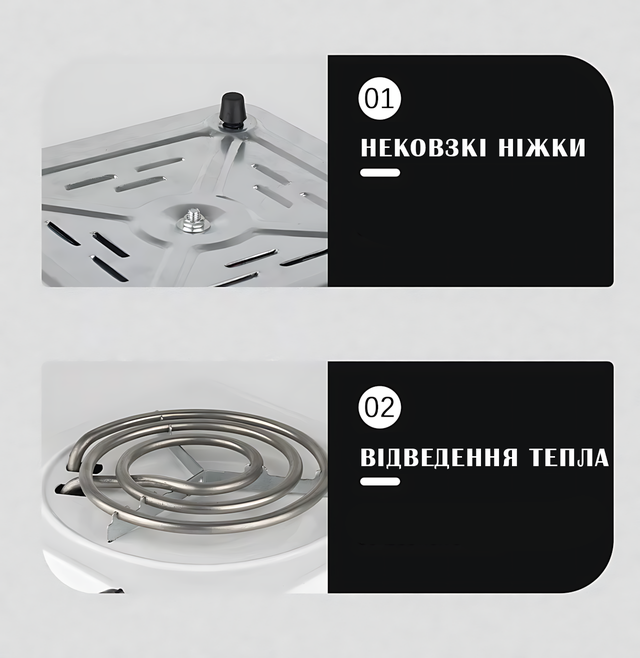 Элегантный белый корпус и прорезиненные ножки делают плиту устойчивой и эстетически привлекательной, а встроенная защита от перегрева гарантирует безопасность использования.