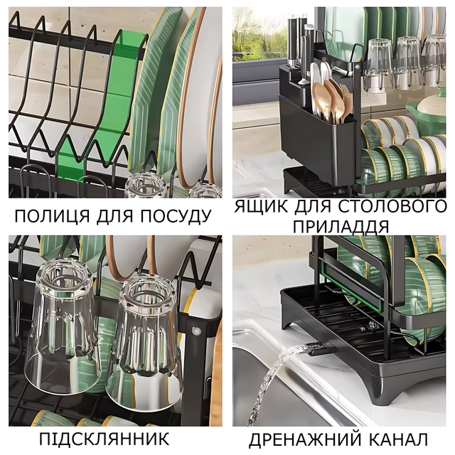 Благодаря 2 уровням сушилка вмещает внушительный объём тарелок, чашек, мисок и столовых приборов. Прочный стальной каркас выдерживает ежедневное использование, а пластиковый поддон собирает капли воды, чтобы поверхность стола всегда оставалась сухой.