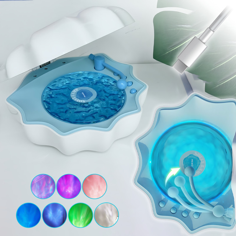 Корпус выполнен в форме раковины — выглядит как элемент интерьерного декора даже днём, а вечером превращает комнату в мягкий «океан под полярным небом».