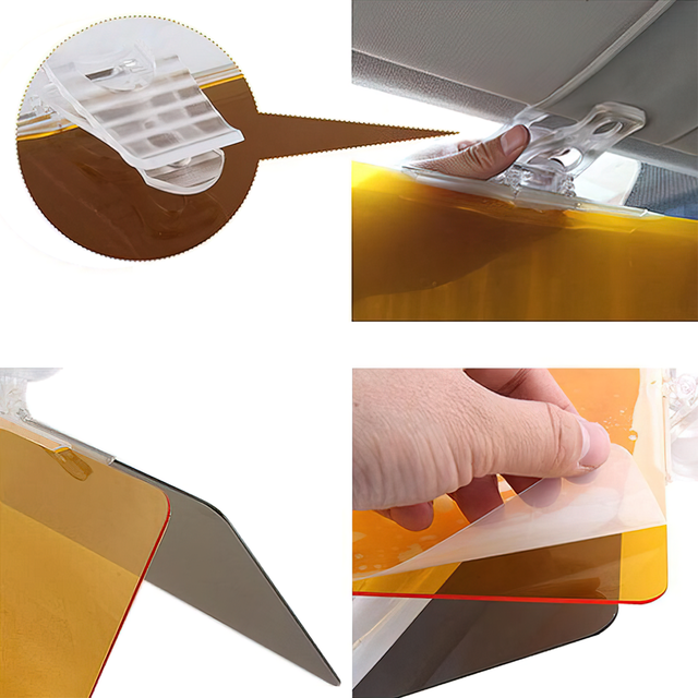 - Универсальное применение: установка на штатный козырек автомобиля не мешает управлению, а фактически заменяет водительские очки двух типов, делая поездки более комфортными и безопасными.
