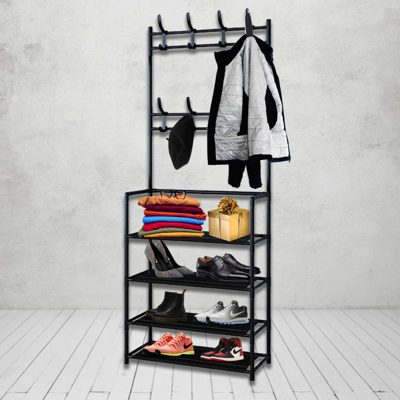 Наличие четырёх дополнительных полок позволяет разместить на стойке больше нужных вещей. На таких многофункциональных полочках можно разместить коробки, обувь одежду и аксессуары.